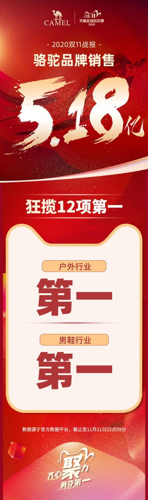 據(jù)駱駝官方發(fā)布的戰(zhàn)報數(shù)據(jù)顯示,從11月11日0點開跑起,駱駝的銷售數(shù)據(jù)就開始一路高歌猛進,勢如破竹一路瘋長,僅僅16分鐘,售額便突破3億元大關,從開頭到結束,駱駝全程領跑行業(yè)其他品牌。最終獲5.18億的銷售額,成為2020雙11鞋服類銷量冠軍。