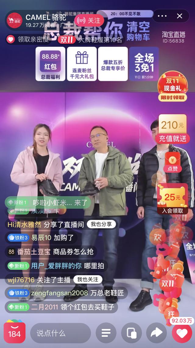 在直播方面,駱駝服飾旗艦店從今年4月便采取每天12小時(shí)不NG的直播模式,實(shí)惠的直播價(jià)格,利益點(diǎn)拉新,通俗易懂的講解風(fēng)格,為店鋪沉淀了一批直播鐵粉用戶。而雙11開始后,企業(yè)高管輪番上陣成了駱駝直播間的一種常態(tài),從開發(fā)經(jīng)理到運(yùn)營(yíng)主管,從營(yíng)銷經(jīng)理到店鋪負(fù)責(zé)人,除了帶貨,駱駝想要借此讓企業(yè)管理者更多地與消費(fèi)者零 距離接觸,聆聽他們內(nèi)心真實(shí)的想法。同時(shí)也希望向受眾傳遞品牌關(guān)注產(chǎn)品、以消費(fèi)者為本的真誠(chéng)態(tài)度。11月10日晚8點(diǎn),駱駝總裁萬金剛現(xiàn)身店鋪直播間將這一辦法推向了高潮。短短30分鐘,他便為眾多新老粉絲送出價(jià)值超過20萬元的巨額福利。當(dāng)晚,除了專業(yè)的帶貨講解,他還就粉絲們關(guān)心的問題進(jìn)行了耐心的回答,讓粉絲們真切地感受到他真誠(chéng)的人格魅力。