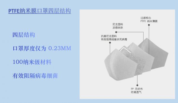 采用HeiQ技術(shù)的可水洗四層防護(hù)口罩,此款口罩為四層結(jié)構(gòu),中間層同時采用了最新型的科技材料e-PTFE膜,該膜由五十層納米級分子構(gòu)造,微孔彎曲復(fù)雜,能夠高效攔截呼吸道飛沫、PM2.5、花粉、油性顆粒以及其他附著有細(xì)菌、病毒等病原體的微粒,同時具有透濕透氣特點(diǎn)。經(jīng)檢測達(dá)到GB/T32610--2016日常無紡布口罩防護(hù)標(biāo)準(zhǔn)。口罩同時把瑞士HeiQ公司的快速殺死病毒的助劑融入纖維里。該助劑在實(shí)驗(yàn)中被證明,對于粘貼在口罩等紡織物上的病毒,能短時間內(nèi)被殺死,有效率99.99%(引用自HeiQ公眾號:HeiQ-China)。HeiQ中國總裁黃女士稱:“我們在這個產(chǎn)品中混合了兩種成分,一種是銀離子,另一種是我們的囊泡成分,我們把這兩種成分結(jié)合在一起使用,就可以將病毒殺死?!盚eiQ技術(shù)可殺死包膜的膜狀物所覆蓋的病毒,比如Covid-19。
