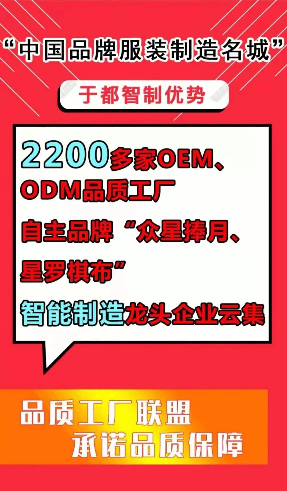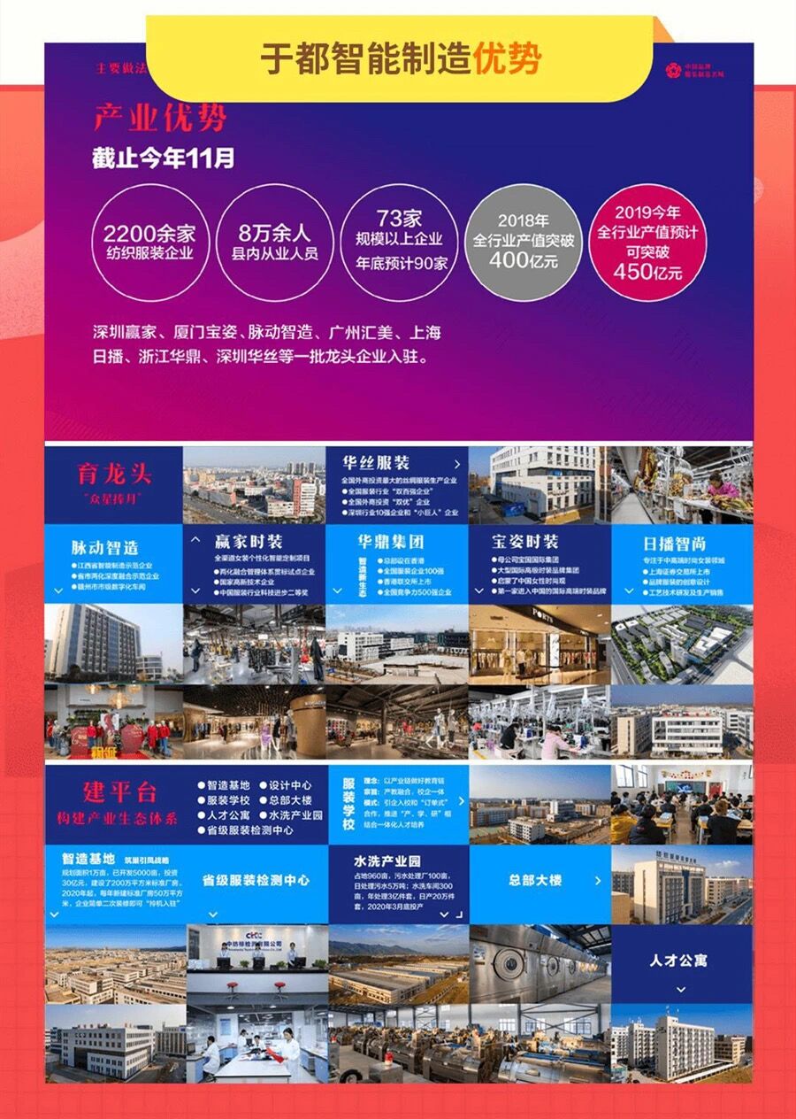 “中國(guó)品牌服裝制造名城”于都是“中國(guó)品牌服裝制造名城”,2200多家OEM、ODM品質(zhì)工廠、自主品牌“眾星捧月、星羅棋布”,智能制造龍頭企業(yè)云集(贏家時(shí)裝、脈動(dòng)智造、華絲服裝、華鼎集團(tuán)、寶姿時(shí)裝、日播智尚等),形成“國(guó)際國(guó)內(nèi)紡織服裝高質(zhì)量彈性供應(yīng)鏈基地”,品質(zhì)工廠聯(lián)盟,承諾品質(zhì)保障。