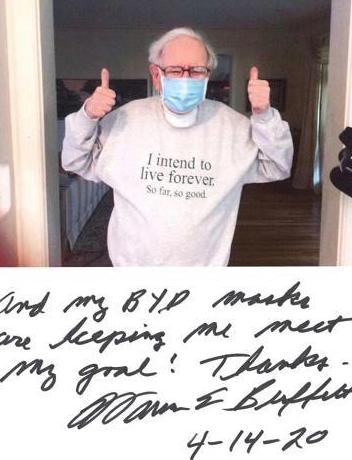 當(dāng)?shù)貢r(shí)間4月14日,股神巴菲特在在其網(wǎng)絡(luò)社交帳號上曬出一張其佩戴比亞迪生產(chǎn)的口罩照片,并配文“我的目標(biāo)是長命百歲,目前為止進(jìn)展還不錯(cuò)。而現(xiàn)在,比亞迪口罩更是助我一臂之力!謝謝!”……