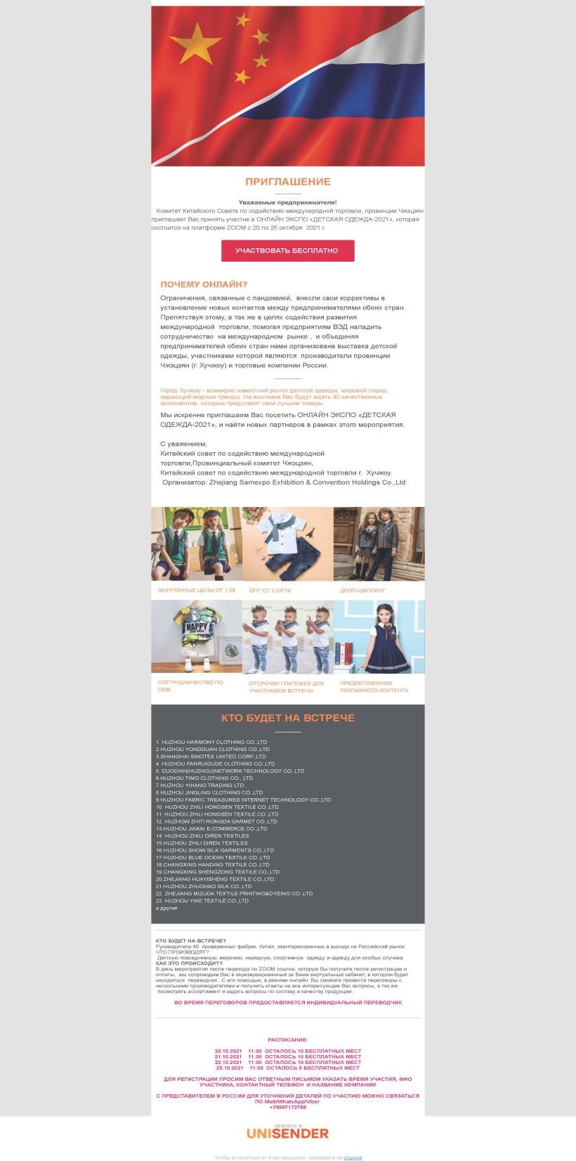 由浙江省貿(mào)促會主辦,湖州市貿(mào)促會、吳興區(qū)商務局共同協(xié)辦,浙江三博會展股份有限公司承辦的“2021浙江名品童裝(湖州-俄羅斯)線上展覽會”于2021年10月24日圓滿落下帷幕!