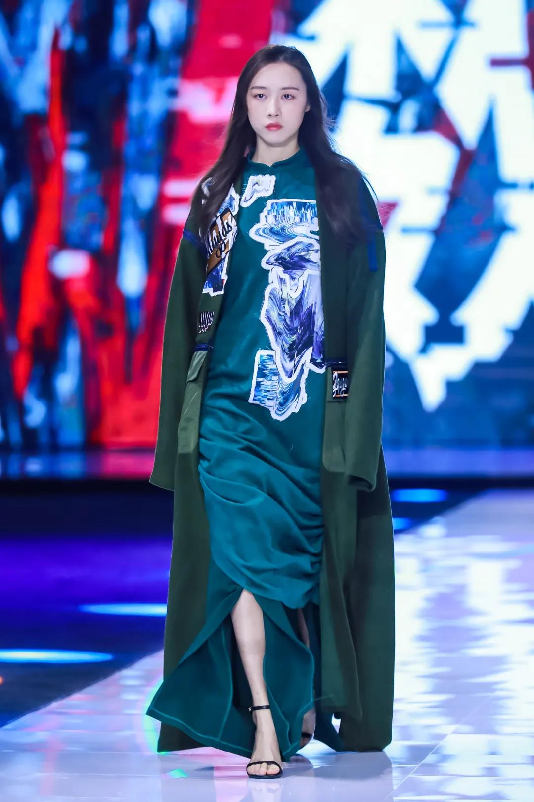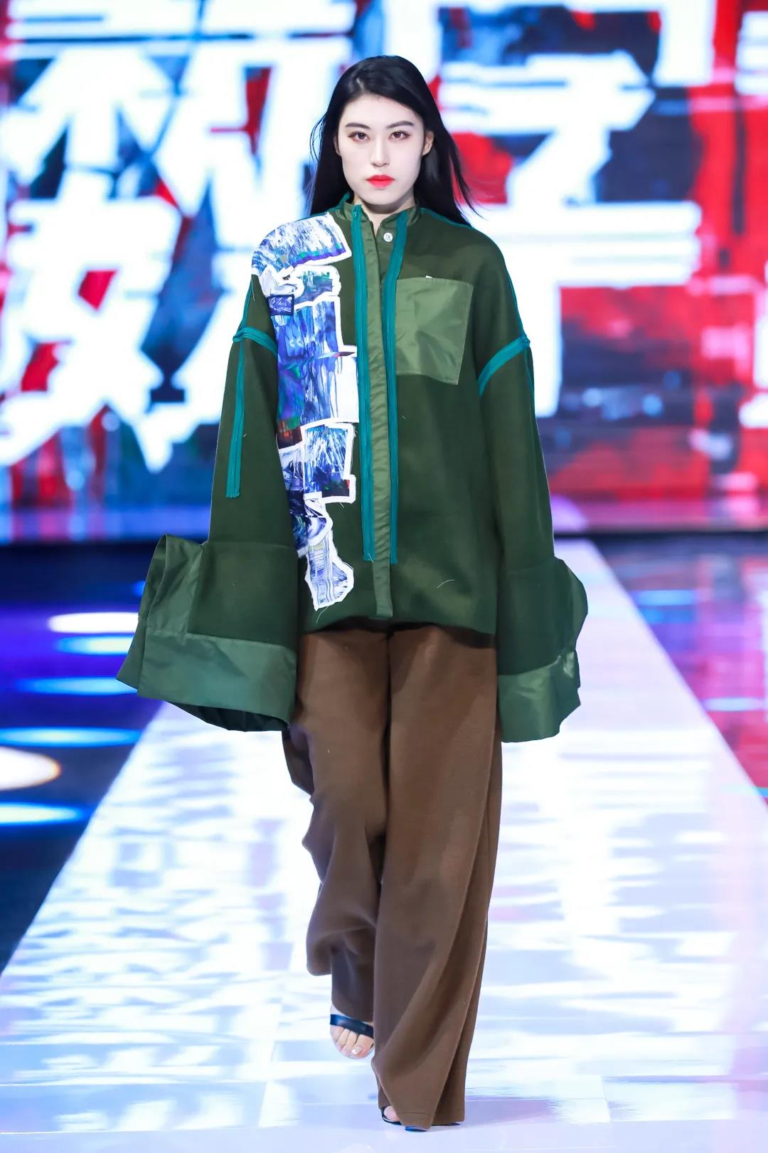 第二系列以綠色調(diào)為主,保留中式服裝寬衣博袖的特點(diǎn),選用寬松平板的服裝版型,搭配多種質(zhì)感的面料營(yíng)造出層次感,再加入電子切割的異形布貼,將設(shè)計(jì)師的抽象繪畫與數(shù)字化融合,使用色彩分離與位移的處理,呈現(xiàn)出數(shù)字化世界特殊的電波與色彩的動(dòng)感。