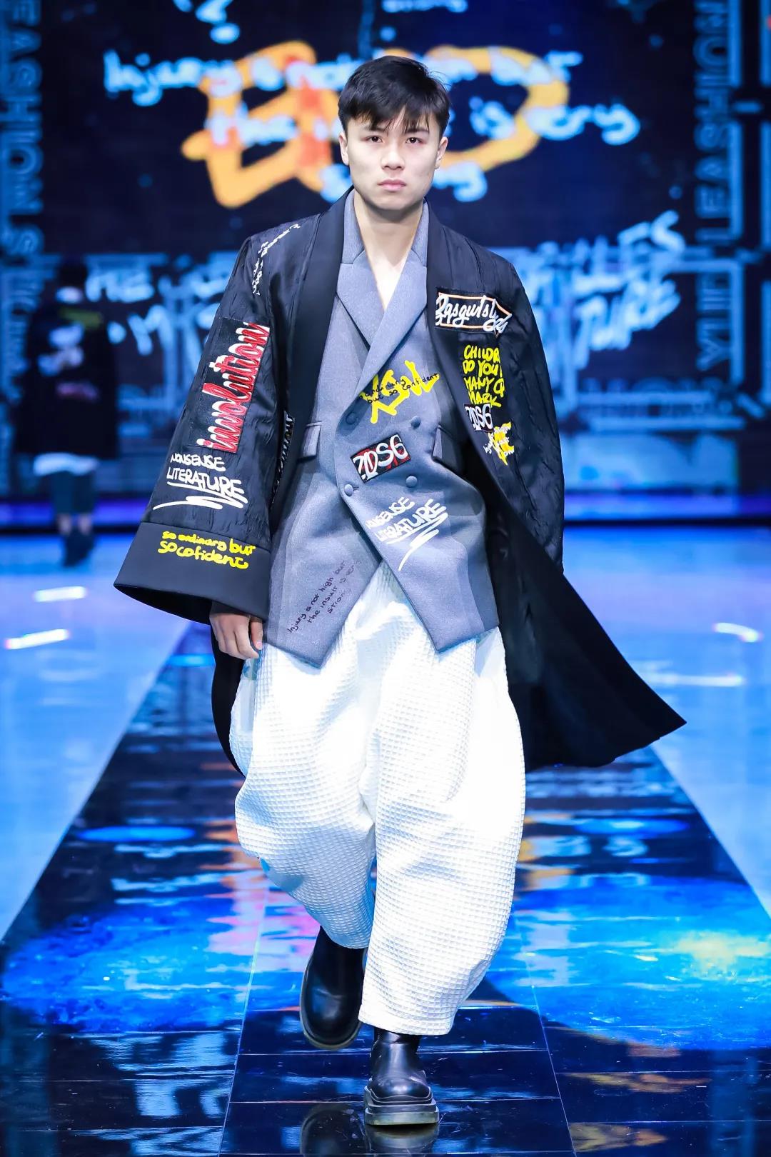 第三系列以黑白灰作為主色調(diào),碰撞明亮的黃色與橘色調(diào),再以層次分明,剪裁利落的男裝,碰撞2021年網(wǎng)絡(luò)語匯的涂鴉,呈現(xiàn)在神秘的網(wǎng)絡(luò)世界活潑俏皮,并極具個(gè)性的氛圍。