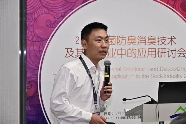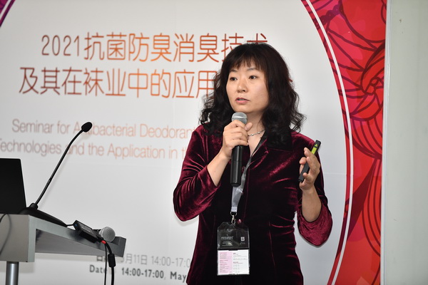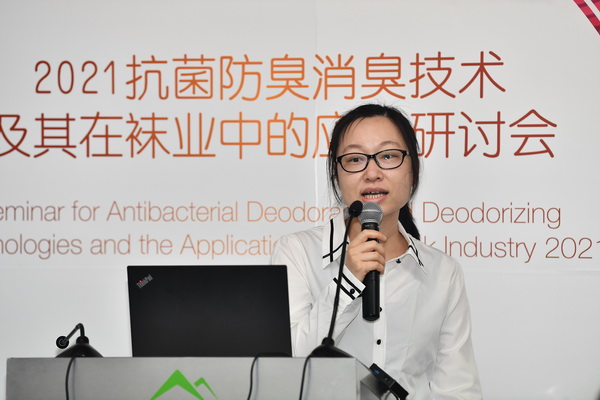 東華大學孫賓教授以《有機分子雜化型金屬系納米材料的構(gòu)筑及其抗微生物功能材料的應(yīng)用開發(fā)》為主題,對其研究的有機分子雜化型金屬系納米抗菌材料及其在襪業(yè)中的應(yīng)用進行了介紹。而妙抗保國際(亞洲)有限公司袁芳經(jīng)理則以《利用抗菌及氣味控制技術(shù)重新定義襪子產(chǎn)品的潔凈》為主題,對妙抗保國際(亞洲)有限公司在襪子氣味方面的研究,以及基于此開發(fā)的抗菌及氣味控制技術(shù)進行了介紹。