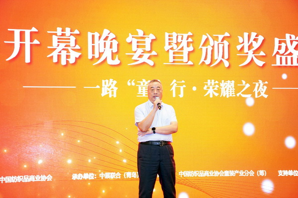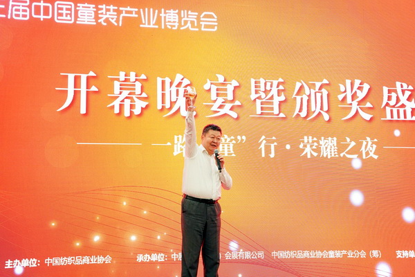中國紡織品商業(yè)協(xié)會李建華會長上臺祝酒,感謝所有童裝人對本屆展會的支持,以及為童裝行業(yè)發(fā)展做出的杰出貢獻。