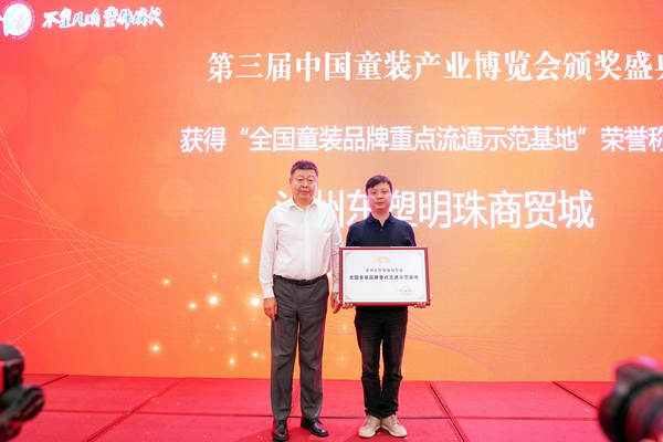 為突出渠道對生產(chǎn)和品牌的重要性,以及其在童裝流通領域做出有的貢獻,頒獎盛典上,中國紡織品商業(yè)協(xié)會會長李建華為滄州東塑明珠商貿(mào)城頒發(fā)“全國童裝品牌重點流通示范基地”榮譽獎牌。