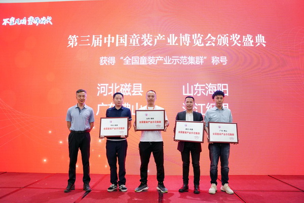 中國紡織品商業(yè)協(xié)會副會長兼秘書長雷利民為廣東佛山、浙江織里、河北磁縣、山東海陽產(chǎn)業(yè)集群頒發(fā)“全國童裝產(chǎn)業(yè)示范集群”獎牌,感謝這些童裝產(chǎn)業(yè)集群一直以來對中國童裝產(chǎn)業(yè)博覽會的支持。