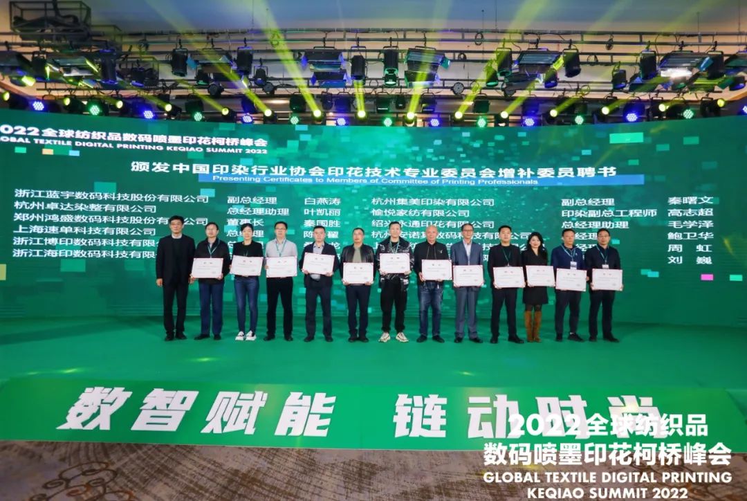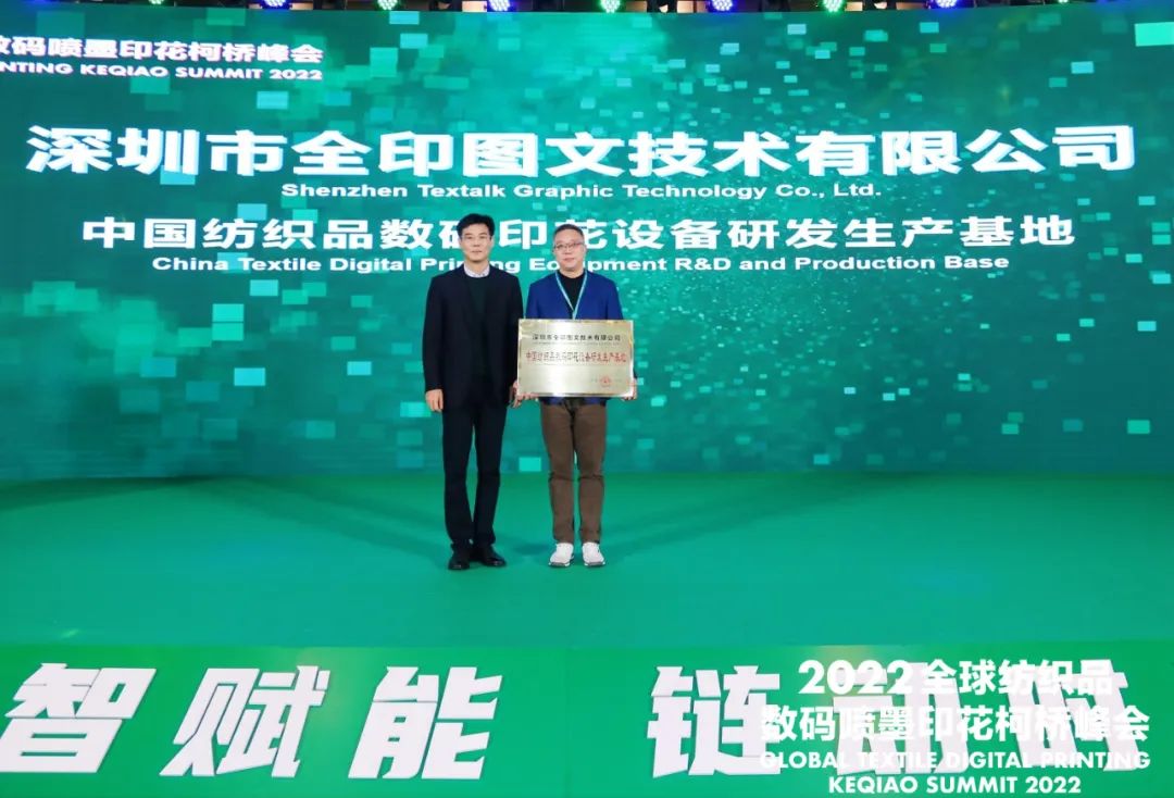 會上,組委會授予中國輕紡城建設(shè)管理委員會“2022全球紡織品數(shù)碼噴墨印花峰會突出貢獻獎”。為深圳市全印圖文技術(shù)有限公司頒發(fā)了“中國紡織品數(shù)碼印花設(shè)備研發(fā)生產(chǎn)基地”銅牌。同時還為第四屆中國印染行業(yè)協(xié)會印花技術(shù)專業(yè)委員會增補委員頒發(fā)了聘書。