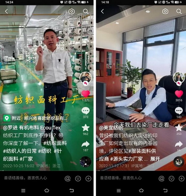柯橋紡織抖音團發(fā)起人之一紹興柯橋天御紡織有限公司總經(jīng)理郭靖表示,公司開始運營抖音以來,線上獲客率已經(jīng)遠遠超出線下,成為工廠主要的獲客渠道。平臺不僅為公司招攬到了80噸的訂單,也吸粉了不少優(yōu)質(zhì)客戶,其中不乏高質(zhì)量的加工廠和服裝品牌公司。持續(xù)發(fā)布的小視頻使企業(yè)每天都能夠收獲超過20個詢盤。
