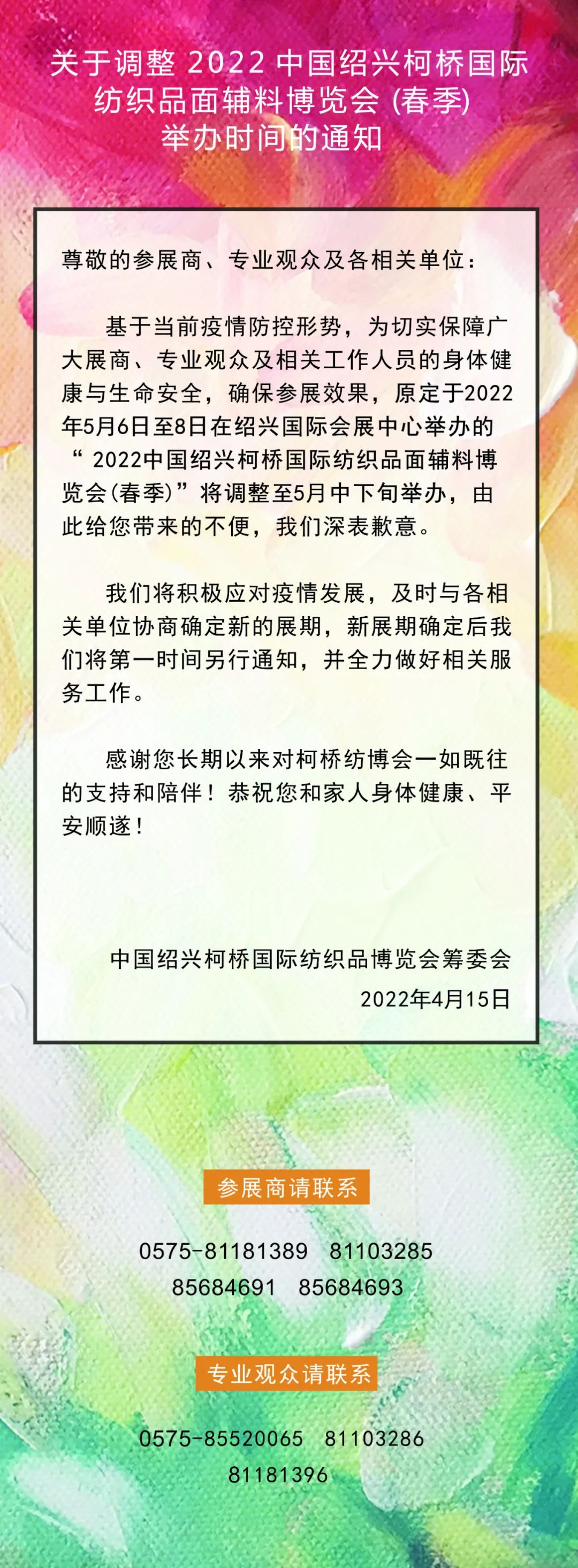 關(guān)于調(diào)整2022中國紹興柯橋國際紡織品面輔料博覽會(春季)舉辦時(shí)間的通知