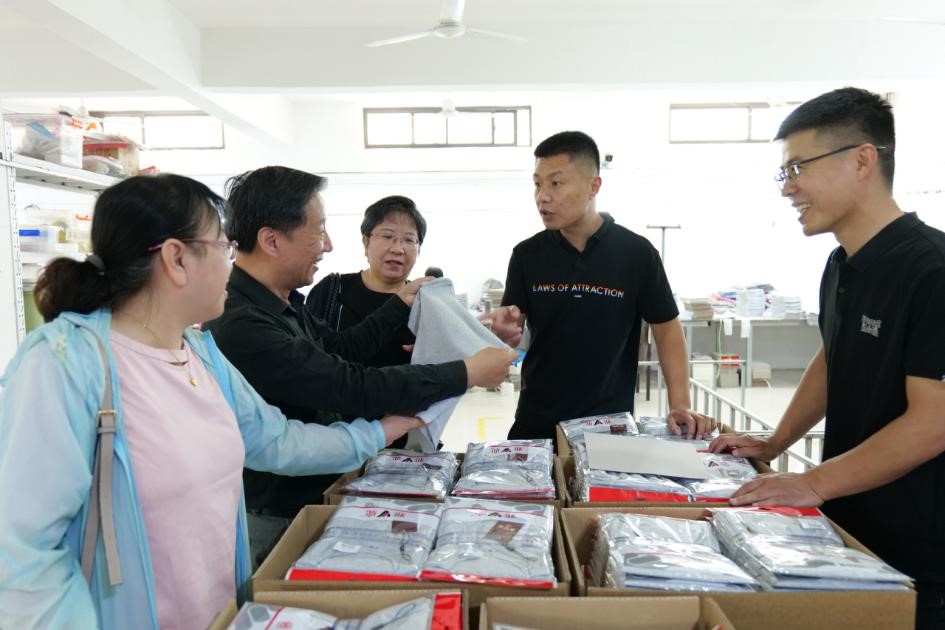 杜府服飾的杜占濤(右二)、杜占杰(右一)向邵光毅會(huì)長(zhǎng)(左二)一行介紹產(chǎn)品