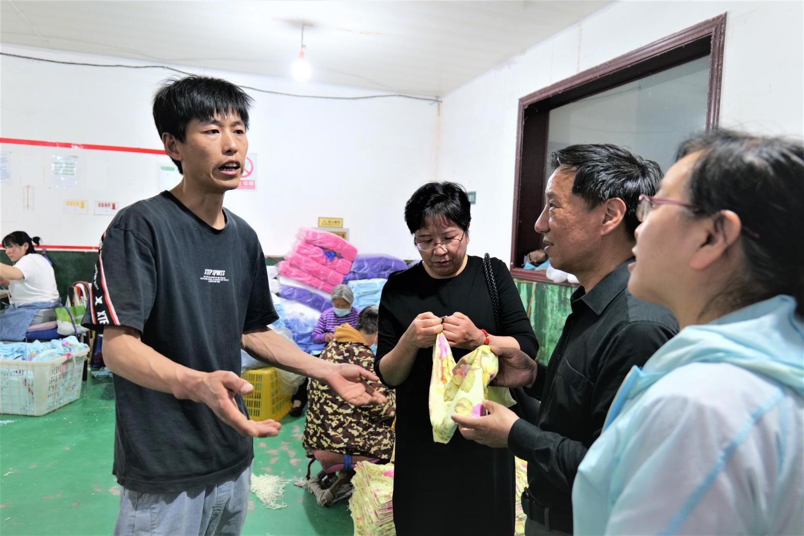 石家莊康澤針織品有限公司總經(jīng)理劉紅衛(wèi)(左)正在介紹企業(yè)生產(chǎn)經(jīng)營(yíng)情況