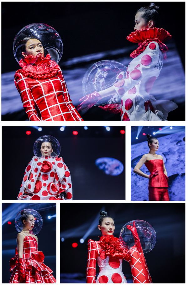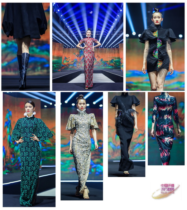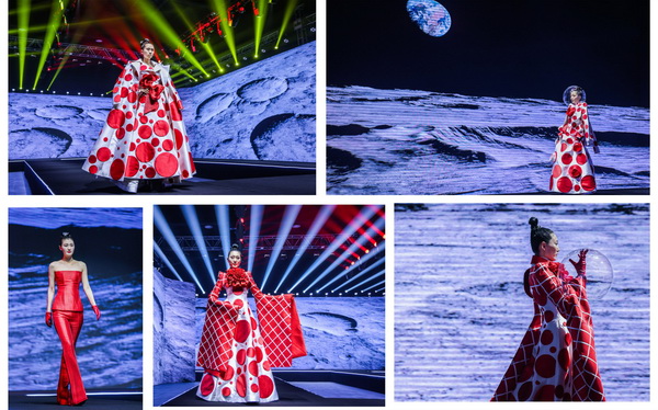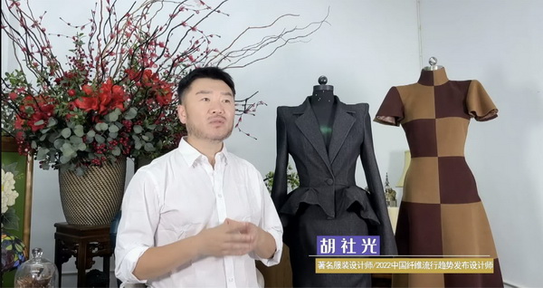 本次跨界大秀胡社光親自構(gòu)思設(shè)計(jì)主題定制服裝,設(shè)計(jì)過程中緊密結(jié)合發(fā)布會主題、兩大篇章八大類流行纖維的內(nèi)涵外延,盡顯纖維之美、纖維之魅。在纖•自然本源篇大秀中,我們看到身穿東方傳統(tǒng)服飾的少女,從巍巍青山中徐徐走來,無處不彰顯著自然之美,非遺漢繡老繡片與高定服裝的完美結(jié)合,更使悠悠纖絲貫穿古今,奔向未來。在纖•蝶變新生篇大秀中,胡社光以未來宇宙為主題--織-天宮,以“無界與共行”為設(shè)計(jì)理念,以同色系的撞色拼接設(shè)計(jì)更彰顯了一種簡約卻又富有層次的時(shí)尚之美、夢幻之美。