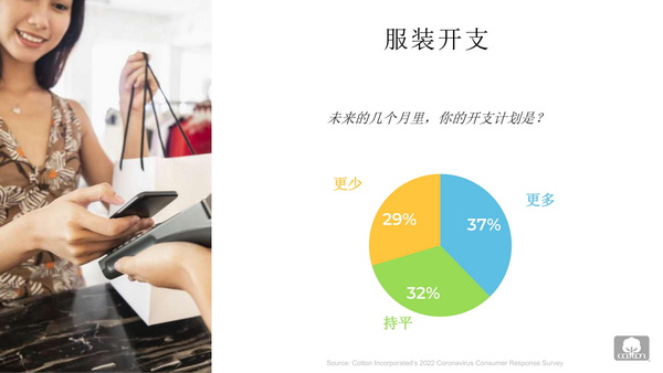 “超過三分之一的消費(fèi)者表示計劃在未來幾個月內(nèi)增加在服裝上的支出。但是,如果疫情繼續(xù)導(dǎo)致停工或通貨膨脹導(dǎo)致基本物品的價格上漲,這意味著消費(fèi)者不得不減少花在衣服上的錢,那么服裝消費(fèi)可能會出現(xiàn)一些放緩?!睆埩⒕V指出。