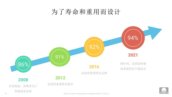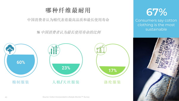 “推動服裝質(zhì)量和耐用性將有助于延長循環(huán)經(jīng)濟(jì)的使用和再使用階段?!睆埩⒕V表示,中國94%的消費(fèi)者選擇質(zhì)量而不是價格。消費(fèi)者需要好質(zhì)量,因此設(shè)計產(chǎn)品需要確保質(zhì)量與耐用性。而中國近三分之二的消費(fèi)者認(rèn)為,與人造絲、滌綸等其他纖維相比,棉質(zhì)服裝的使用壽命是最長與最可持續(xù)的。