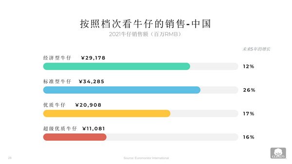 近一半的中國消費(fèi)者表示,今年他們計劃購買比去年更多的牛仔褲。預(yù)計到2026年,牛仔褲的銷售額將強(qiáng)勁增長19%,達(dá)到近1130億元。張立綱指出,按牛仔褲種類來看,經(jīng)濟(jì)型和標(biāo)準(zhǔn)型牛仔褲占中國牛仔褲銷售額的大部分,占市場的近66%。在未來五年中,中端價位標(biāo)準(zhǔn)牛仔褲的增長最快,緊隨其后的是高檔和超高檔牛仔褲。