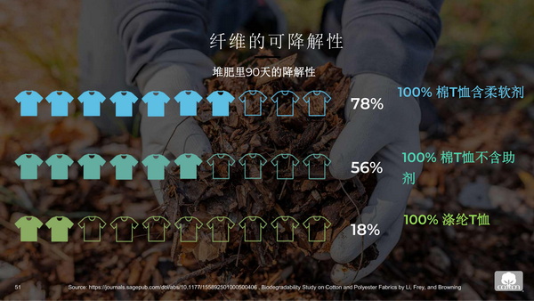 循環(huán)的最后一個支柱是可降解。近四分之三的中國消費(fèi)者表示,服裝由可生物降解的材料制成很重要。Cotton Incorporated與北卡羅來納州立大學(xué)合作研究發(fā)現(xiàn),在30天后,棉在廢水中降解了90%以上,在淡水中降解了80%,在鹽水中降解了接近50%,并且在所有這些環(huán)境中能夠完全降解。張立綱強(qiáng)調(diào),作為植物和天然纖維,棉本質(zhì)上是可循環(huán)的。