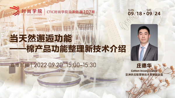 9月20日,Cotton Incorporated亞洲供應(yīng)鏈營銷技術(shù)營銷副總監(jiān)莊德華先生做客“CTIC時尚學(xué)院”直播平臺,攜手中國女裝面料流行趨勢研究院共同帶來了《當(dāng)天然邂逅功能-棉產(chǎn)品功能整理新技術(shù)介紹》。通過對TransDRY™、WICKING WINDOWS™、SWEAT-HIDING、STORM COTTON™和TOUGH COTTON™等棉產(chǎn)品的新型功能整理技術(shù)原理和性能優(yōu)勢的解讀,莊德華分享了在棉上實現(xiàn)吸濕快干、超級防水及持久耐磨等功能的解決方案。