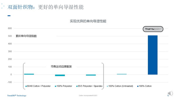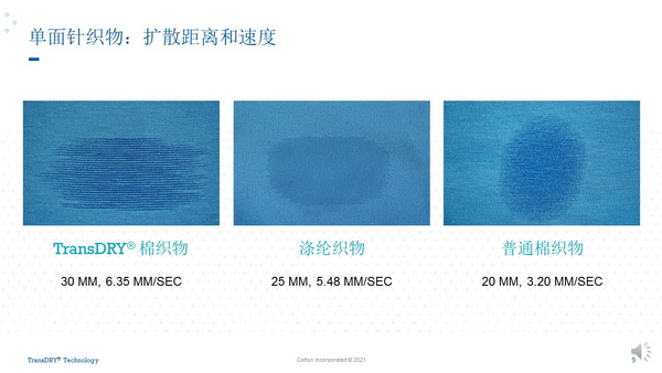 莊德華首先分享了三種在棉質(zhì)面料上實現(xiàn)濕氣管理性能的整理技術(shù)。其中,TransDRY™技術(shù)通過將特殊拒水加工后的棉紗與普通紗線交織排列,起到了吸濕、排汗和快干的作用?!霸擁椉夹g(shù)的關(guān)鍵在于紗線處理,可通過不同排紗方式,實現(xiàn)汗液/濕氣從橫向、縱向到由內(nèi)到外的單向?qū)窆δ?,不同的織物結(jié)構(gòu)會有不同的性能表現(xiàn)?!?/span>