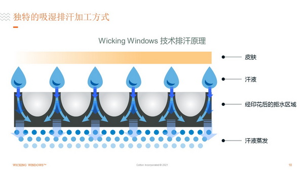 棉的另一項吸濕排汗技術(shù)WICKING WINDOWS™則是在面料反面部分區(qū)域以印花方式印上防水劑,通過控制印花漿料的滲透,保證防水劑不接觸到面料正面,當(dāng)水分或濕氣通過沒有防水劑處理的區(qū)域后,即從面料反面?zhèn)鲗?dǎo)到面料正面,并在空氣中蒸發(fā),從而實現(xiàn)單向?qū)?。在不同組織結(jié)構(gòu)的面料上,WICKING WINDOWS™都可以實現(xiàn)迅速的吸水。