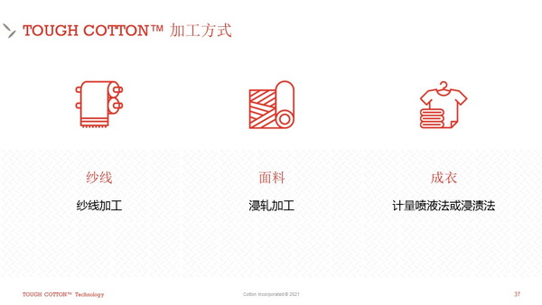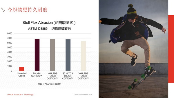 莊德華指出,該項技術(shù)采用的聚乙烯軟油能夠提高面料的耐磨性及撕破強力,交聯(lián)劑(PBI)則提高了面料的功能耐久性?!皩τ赥OUGH COTTON™,我們有嚴(yán)格的性能指標(biāo),需要處理后的面料經(jīng)過20次洗烘之后,耐磨程度較處理前的面料提高2倍以上才為合格。”