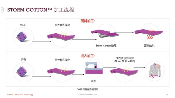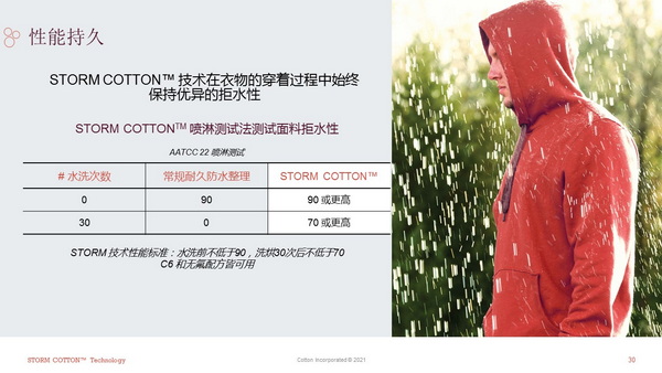 STORM COTTON™技術(shù)是一項用于棉制面料或服裝的超久耐久拒水整理技術(shù),可賦予穿著者良好的抗雨雪性能并保持棉天然的舒適性。這項技術(shù)不影響棉的透氣性和柔軟度,可應(yīng)用于面料或成衣,不限于針織、機織和牛仔產(chǎn)品。