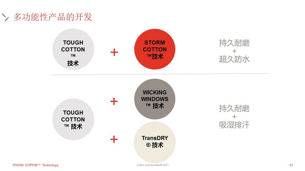 以上介紹的五項功能整理技術(shù)還可以疊加使用,以打造具有復(fù)合功能的棉產(chǎn)品。比如,將TOUGH COTTON™與STORM COTTON™相結(jié)合,主推持久耐磨+超久防水的概念,也可將TOUGH COTTON™與TransDRY™或WICKING WINDOWS™相結(jié)合,主打持久耐磨+吸濕排汗的概念。莊德華表示,“棉已經(jīng)不僅僅是大家傳統(tǒng)以為的天然、舒適、透氣、柔軟,在加持各項功能性后,它完全可以變成出得戶外+健身,入得公司+派對的全能24小時服裝!”