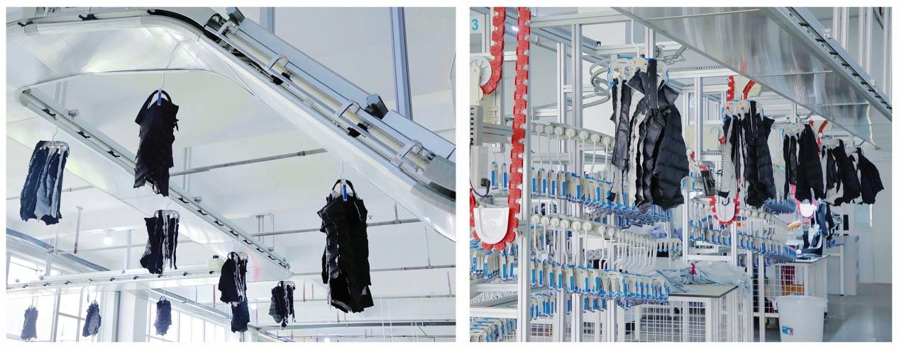 智能工廠分為兩層,第一層分布著裁床區(qū)、模版區(qū)、零部件組、充絨房、驗(yàn)針?lè)?、拍絨房等,相關(guān)工作人員會(huì)在一樓完成面料裁制、衣物零部件加工、給裁片充絨和封口等工作。這些生產(chǎn)環(huán)節(jié)完成后,會(huì)由一名工作人員將不同裁片放置到智能吊掛設(shè)備上,通過(guò)傳送帶運(yùn)送至二樓。相當(dāng)于裁片“坐上了電梯”。