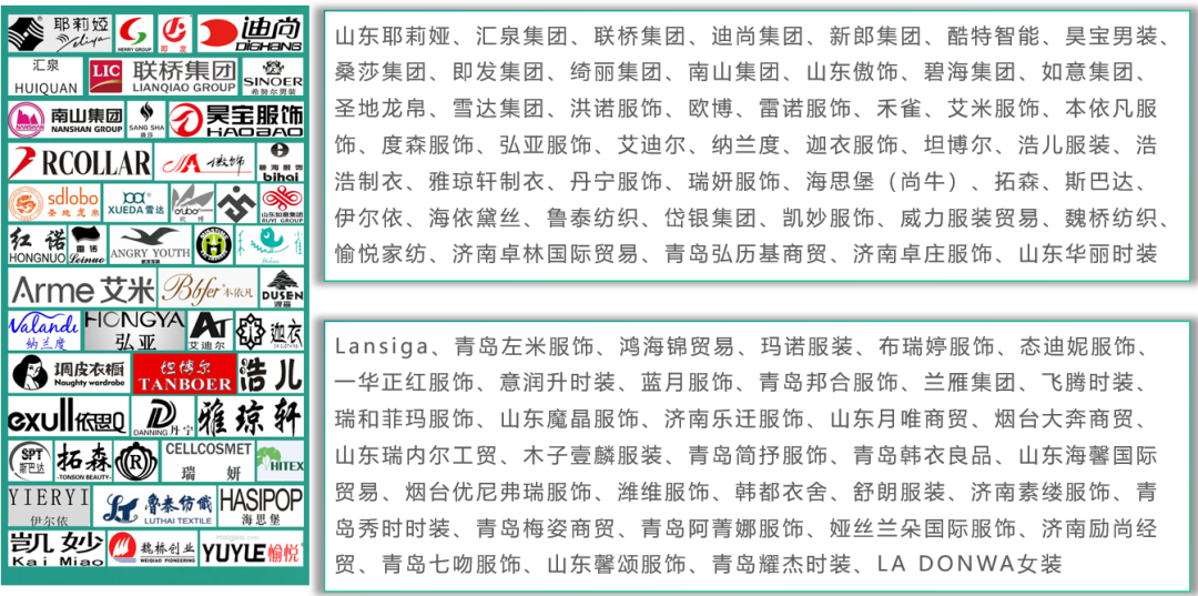 上海裕承商貿(mào)、寧波博洋服飾集團(tuán)、上海棉花堂商貿(mào)、寧波瑞凌達(dá)、嘉興思凱服飾、弘法公機(jī)國際貿(mào)易、杭州嘉遠(yuǎn)、青島孚士綸紡、青島紡聯(lián)集團(tuán)、青島天繪、依美時尚、杭州楚帛時裝、青島格萊默服裝、青島格萊默服裝、青島瑞蓬服裝、青島素襟、青島天蝎座、青島愛蒂恩、青島衣恩諾、青島海利緯服裝、青島金盛國宇、聯(lián)橋集團(tuán)、青島龍仕達(dá)、青島垚鑫允進(jìn)出口、青島藝豐泰、山東新華錦、山東耶莉婭、青島樂好服飾、施韋詩國際貿(mào)易、浙江隴越貿(mào)易、雪達(dá)集團(tuán)、青島浩爾服飾、青島榮和祥外貿(mào)、嘉興開心索點(diǎn)子商務(wù)、上海申達(dá)進(jìn)、廣州利好服裝、深圳市拓嘉、廣州索駿貿(mào)易、廣州汐汶優(yōu)木、森女部落、質(zhì)加服飾、深圳詩伊美服飾......