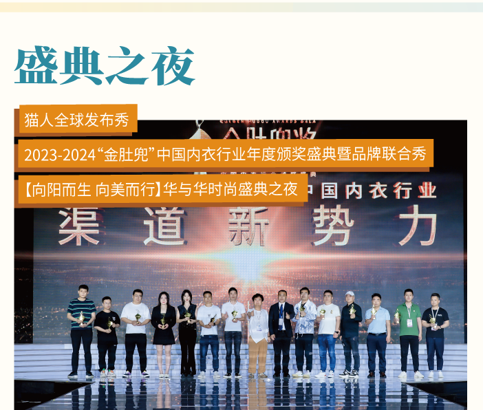 作為內(nèi)衣業(yè)的“奧斯卡”獎——金肚兜獎,以行業(yè)至高榮譽褒獎過去一年在內(nèi)衣產(chǎn)業(yè)創(chuàng)新、渠道創(chuàng)新、產(chǎn)品創(chuàng)新等方面做出卓著貢獻的企業(yè)。同時更有頗具前瞻看點的貓人全球發(fā)布秀、華與華時尚盛典之夜,盡展品牌新姿,掀起時尚新風潮,將為觀眾帶來精彩紛呈的視聽盛宴。