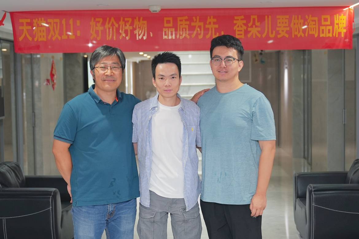 圖片說(shuō)明:10月26日,南京大學(xué)教授羅震東(左一)帶著學(xué)生,來(lái)到淘寶女裝頭部商家廣州香朵兒服飾有限公司調(diào)研,與公司創(chuàng)始人趙曉忠合影。