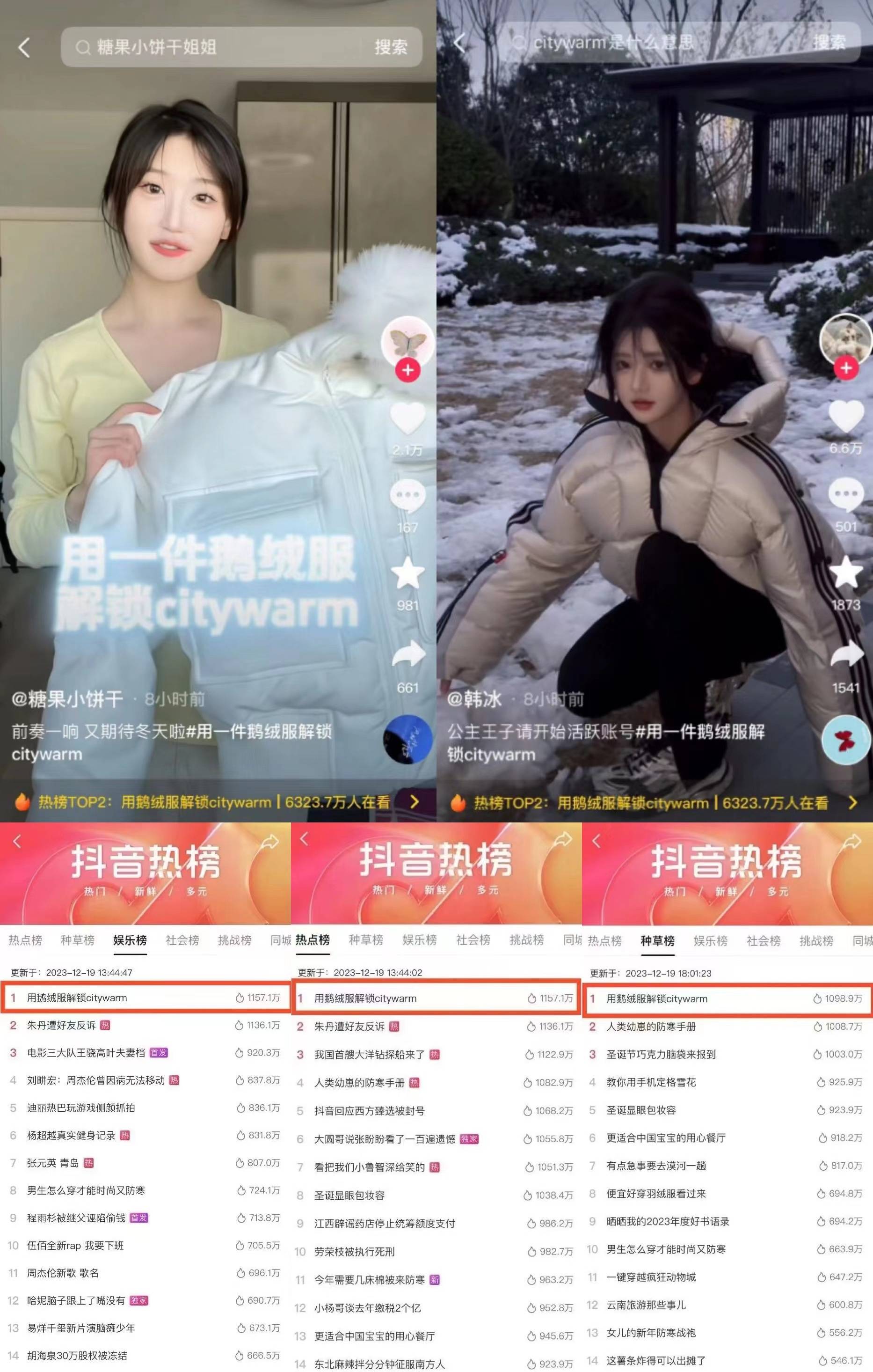 首先,直播發(fā)布會前期在抖音平臺發(fā)起了#用一件鵝絨服解鎖citywarm 挑戰(zhàn)賽話題,吸引了@蠟筆小新~、@韓冰 、@我叫Abbily(艾比)等平臺達(dá)人紛紛參與,以近期的大雪紛飛為種草背景,深度強(qiáng)化鵝絨服輕盈、保暖的優(yōu)勢亮點,并在評論區(qū)引導(dǎo)用戶關(guān)注中國新發(fā)布。挑戰(zhàn)賽話題一經(jīng)上線,便受到廣泛歡迎,同時登上抖音娛樂榜、熱點榜、種草榜榜單第一。
