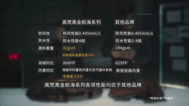 二是新品多角度的橫向直觀對比。對消費(fèi)者而言,“事實勝于雄辯”。為此,《中國新發(fā)布》主題直播發(fā)布會現(xiàn)場,央視網(wǎng)以真實測試結(jié)果展現(xiàn)高梵品牌實力。在央視測試中,高梵黑金航海系列新品與國際大牌羽絨服共同面對面料性能、保溫性能、輕盈度、羽絨品質(zhì)等四個維度的測試,實驗結(jié)果顯示,高梵黑金航海系列新品在每項測試中均有更優(yōu)表現(xiàn),領(lǐng)先某品牌?,F(xiàn)場還發(fā)起測評小實驗,以更直觀的現(xiàn)場表現(xiàn),生動展現(xiàn)了高梵黑金航海系列新品更防寒、更輕盈、更保暖的產(chǎn)品實力。