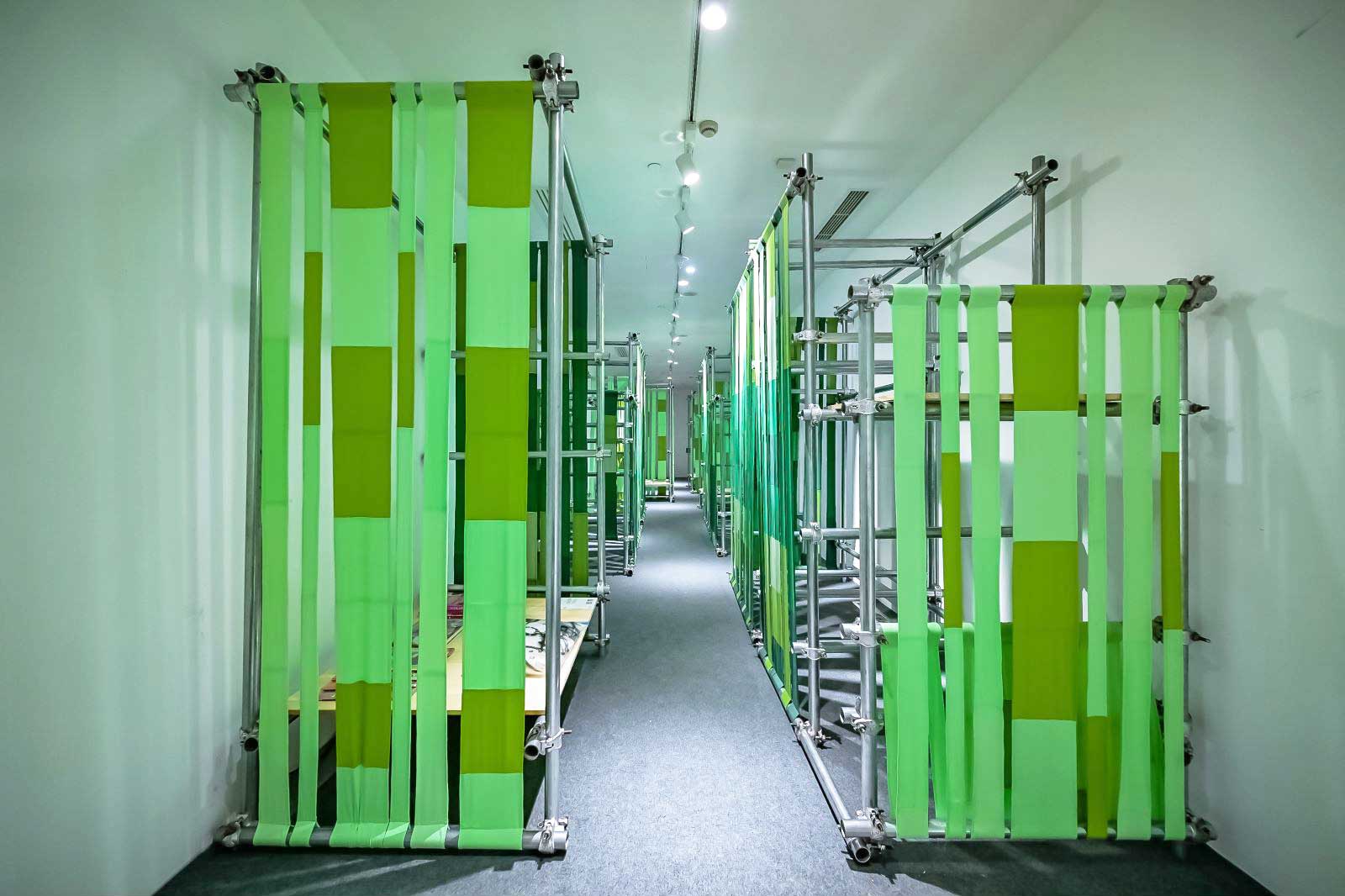 作為展覽的壓軸之作,解構(gòu)與重組城市叢林的現(xiàn)代科技,不同材質(zhì)、形態(tài)的舊椅子升級(jí)再造,能否令人回歸于“人閑桂花落,青青山澗中”的向往?明暗相見的SORONA®生物基材料制成的面料結(jié)合回收腳手架結(jié)構(gòu),在明亮燈光的映射下,創(chuàng)造出一片靜謐幽深的“竹徑”??臻g盡頭設(shè)有休憩、閱讀、陳列三個(gè)功能區(qū)域,其中閱讀區(qū)陳列有SAME PAPER為本次展覽特別提供的30本珍藏樣書,讓藝術(shù)感與實(shí)用性“相遇”,將自然與生活合二為一,徘徊在一段浸染了時(shí)間與記憶的共生情感間。