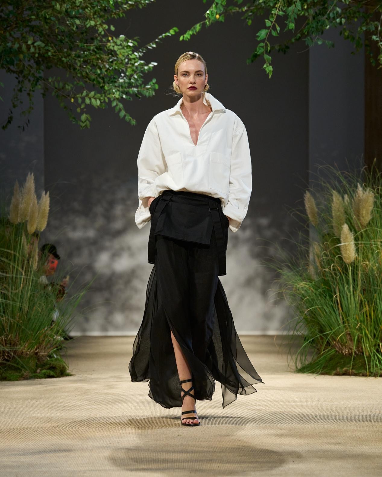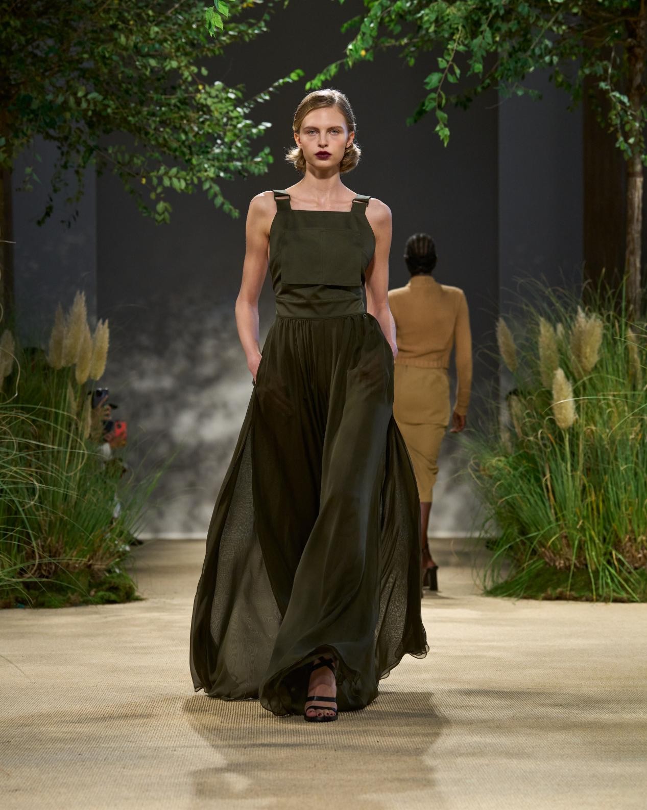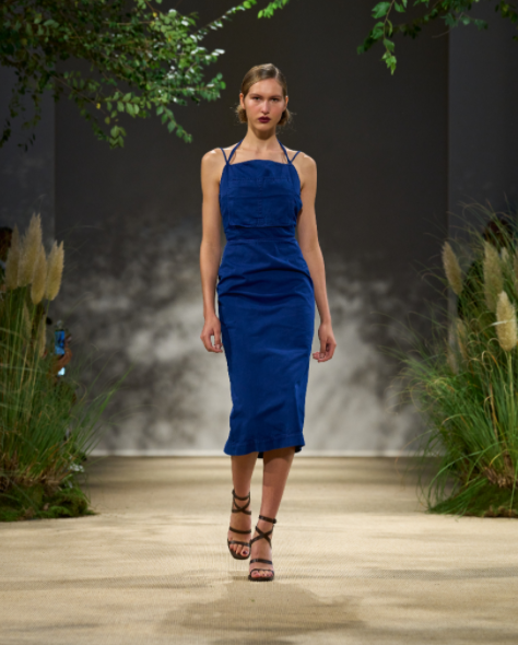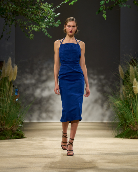 露背吊帶裙以園丁圍裙為靈感,三層雪紡禮裙配以華達(dá)呢肩帶,展現(xiàn)硬朗的時(shí)髦風(fēng)范,晝夜皆宜穿著。