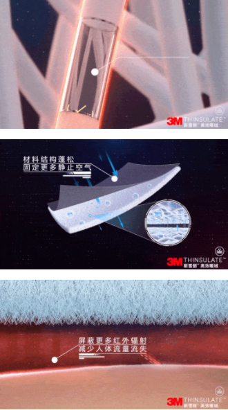 與傳統(tǒng)保暖材料相比,3M™新雪麗™系列產(chǎn)品具有優(yōu)良的保暖特性,憑借其黃金三角保暖結(jié)構(gòu),即導(dǎo)熱率低、結(jié)構(gòu)蓬松以及屏蔽人體輻射,實現(xiàn)優(yōu)異的保暖性能,在防寒產(chǎn)品上逐漸取代了傳統(tǒng)保暖材料,并廣泛被世界各大知名品牌運(yùn)用。