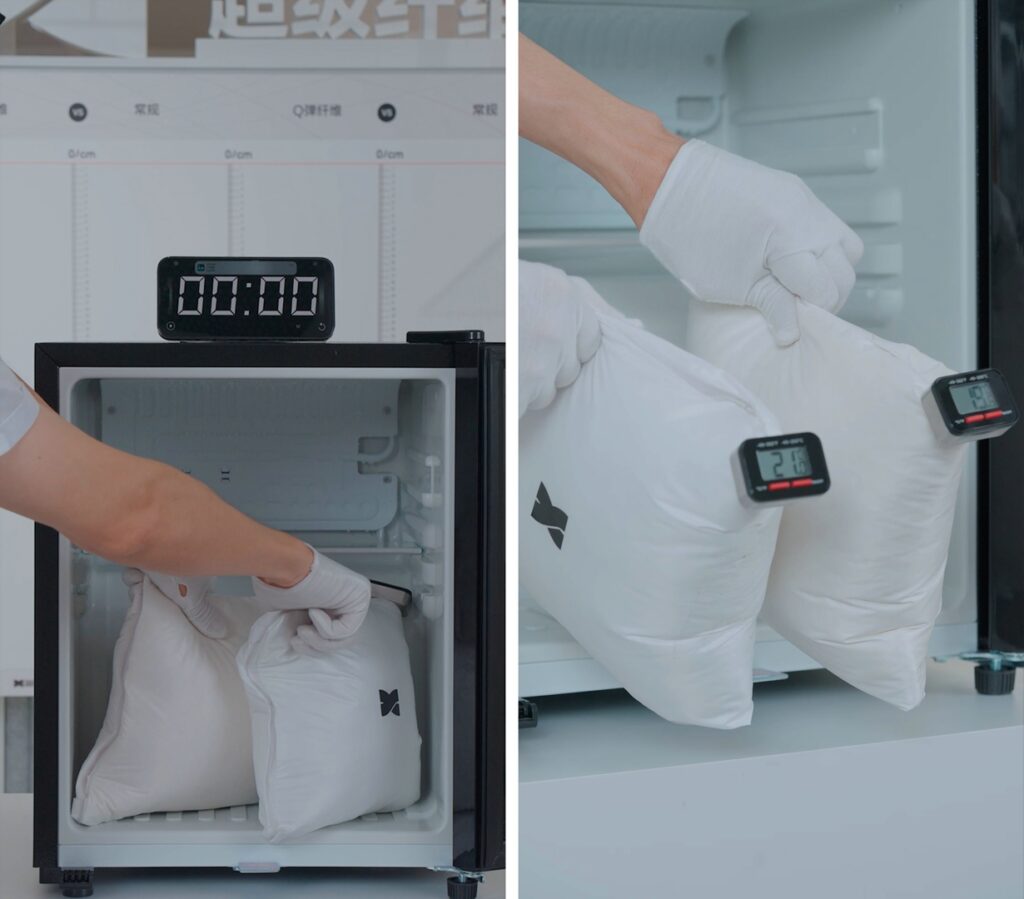 將處于相同溫度環(huán)境下的“暖芯纖維”制成的科技棉包和90絨子含量制成的羽絨包,同時放入冰柜中,8分鐘以后,分別查看包裹在兩者中間的溫度計的指數(shù),可以看出“暖芯纖維”保暖效果可媲美90絨。