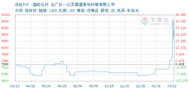 12月12日盛虹化纖關(guān)于滌綸POY的報價為6850元/噸。滌綸POY的規(guī)格:分類:熔體紡;粗細:150D;孔數(shù):48F;等級:優(yōu)等品;顏色:白;色澤:半消光。該報價有效期為3天。報價提供方:江蘇國望高科纖維有限公司。