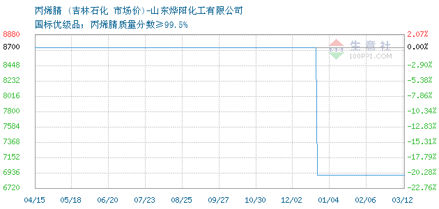 12月15日吉林石化關(guān)于丙烯腈的報(bào)價(jià)為8700元/噸。丙烯腈的規(guī)格:國(guó)標(biāo)優(yōu)級(jí)品;丙烯腈質(zhì)量分?jǐn)?shù)≥99.5%。該報(bào)價(jià)有效期為3天。報(bào)價(jià)提供方:山東燁陽(yáng)化工有限公司。