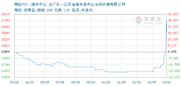 12月15日江蘇省海安縣中山合成纖維有限公司關于錦綸POY的報價為11600元/噸。錦綸POY的規(guī)格:等級:優(yōu)等品;粗細:86D;孔數:24F;色澤:半消光。該報價有效期為3天。報價提供方:江蘇省海安縣中山合成纖維有限公司。