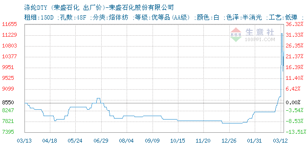 12月16日榮盛石化關(guān)于滌綸DTY的報價為7750元/噸。滌綸DTY的規(guī)格:粗細:150D ;孔數(shù):48F ;分類:熔體紡 ;等級:優(yōu)等品(AA級) ;顏色:白 ;色澤:半消光 ;工藝:低彈 ;。該報價有效期為7天。報價提供方:榮盛石化股份有限公司。