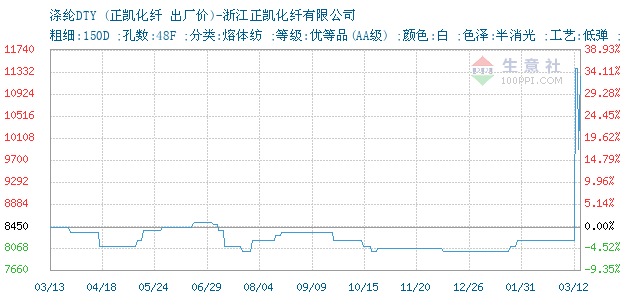 12月16日浙江正凱化纖有限公司關(guān)于滌綸DTY的報(bào)價(jià)為8000元/噸。滌綸DTY的規(guī)格:粗細(xì):150D ;孔數(shù):48F ;分類:熔體紡 ;等級(jí):優(yōu)等品(AA級(jí)) ;顏色:白 ;色澤:半消光 ;工藝:低彈 ;。該報(bào)價(jià)有效期為7天。報(bào)價(jià)提供方:浙江正凱化纖有限公司。