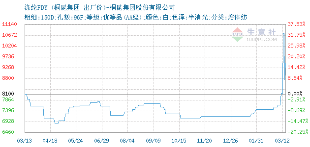 12月16日桐昆集團(tuán)關(guān)于滌綸FDY的報(bào)價(jià)為7150元/噸。滌綸FDY的規(guī)格:粗細(xì):150D;孔數(shù):96F;等級:優(yōu)等品(AA級);顏色:白;色澤:半消光;分類:熔體紡。該報(bào)價(jià)有效期為7天。報(bào)價(jià)提供方:桐昆集團(tuán)股份有限公司。