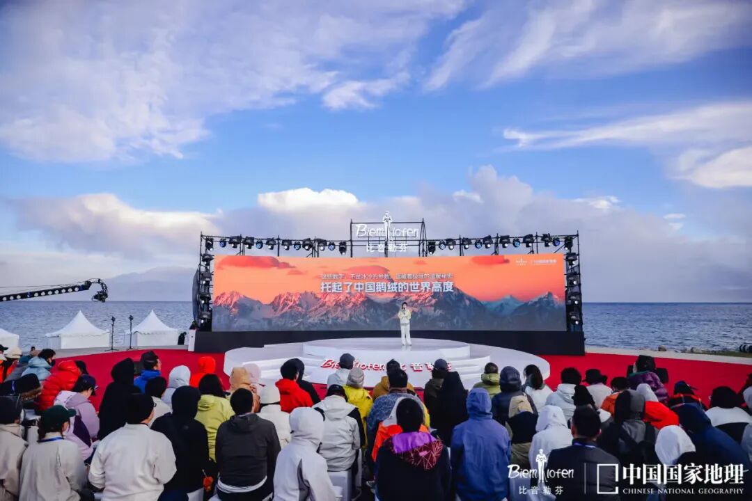 中國國家地理雜志社社長兼總編輯李栓科、中國國家地理發(fā)行公司總經(jīng)理李寧、中國服裝協(xié)會常務(wù)副會長謝青、中國紡織信息中心副主任李波、比音勒芬集團總經(jīng)理謝邕、比音勒芬品牌大使胡一天、比音勒芬品牌大使李蘭迪、中央廣播電視總臺主持人大賽金獎得主蔡紫等百余位嘉賓驚喜現(xiàn)身賽里木湖畔,共同暢聊來自東方的世界好鵝絨。