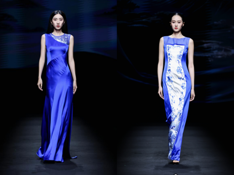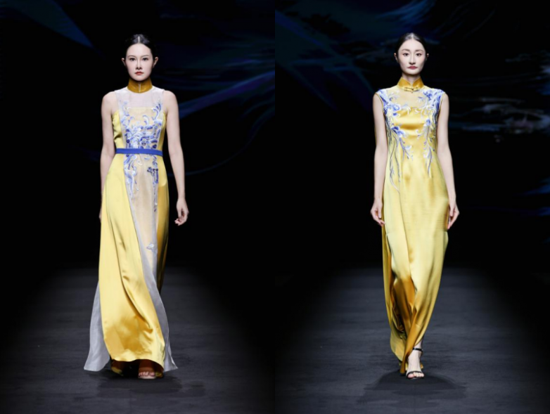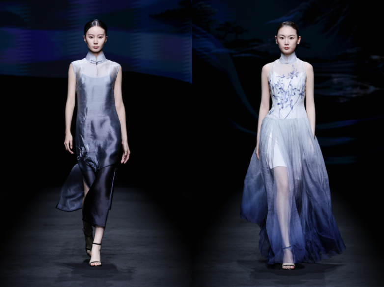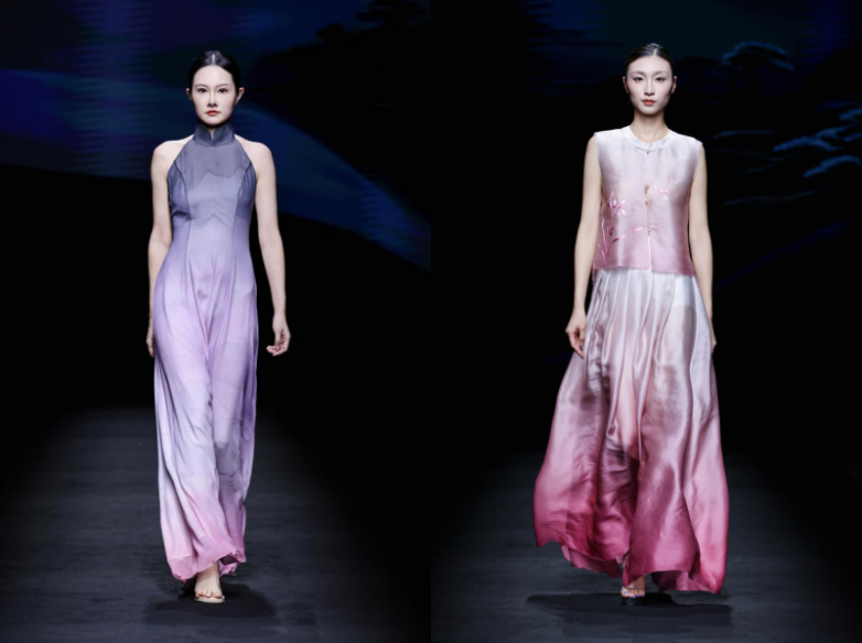 “華夏蘭繡” 系列循此雅韻而來,取傳統(tǒng)色 “遠山黛” 摹山巒清寂、“海天霞” 繪云霞爛漫,將建蘭的疏影風骨織入衣衫 —— 歐根紗的輕盈、柯根緞的挺括、喬其的柔糯與彈力緞的絲滑,在材質碰撞間還原蘭花的靈動姿態(tài)。更巧借建蘭與品牌主理人戚秋蘭之名的契合,讓服飾成為品格的載體,將 “空谷幽蘭” 的女性氣質具象呈現(xiàn)。