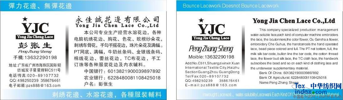 永佳誠花邊織造有限公司 YongJiaChengLace Co.,Ltd 本公司擁有國際水平的一系列先進的瑞士電腦飛梭“蘇拉”刺繡機、電腦特種繩繡機、平繡繡花機、多頭珠片繡花機等生產(chǎn)設(shè)備和一流的電腦設(shè)計、制版及打樣中心,科學(xué)的技術(shù)管理,優(yōu)秀的營銷人才隊伍和完善的生產(chǎn)及銷售為一體的實力企業(yè)。 專業(yè)生產(chǎn)銷售各種材質(zhì)的領(lǐng)花、胸花、對花,特種三合一繩繡花邊及棉線盤花,水溶花邊,刺繡花邊,刺繡滿幅,珠片花邊,網(wǎng)布繡及棉布繡花邊,電腦繡圍巾,手勾手搖花邊,車骨花邊,訂珠花邊等一系列電腦刺繡產(chǎn)品,廣泛適用于服飾、家紡、箱包、鞋帽、玩具等領(lǐng)域。歡迎各界需求人士來電來函洽談,本司將免費為您打板和提供你所需的產(chǎn)品樣板,永佳誠期待您的佳音! 電話:+86-20-89107732 傳真:+86-20-89103172 13632290198 聯(lián)系人:彭張生(總經(jīng)理) E-mail:pzs888@163.com yongjiachenglace@163.com Msn:pzs888@live.cn QQ:358676461 631567920 498250239 關(guān)于更多的產(chǎn)品請關(guān)注我們的網(wǎng)站: www.yongjiachenglace.cn