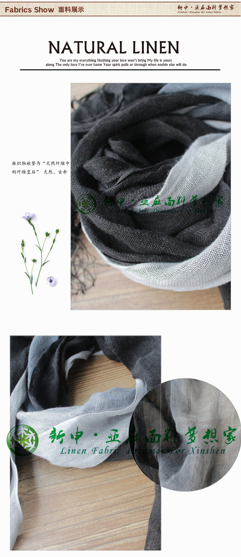 復(fù)古文藝范黑灰漸變色流蘇亞麻圍巾面料