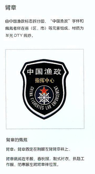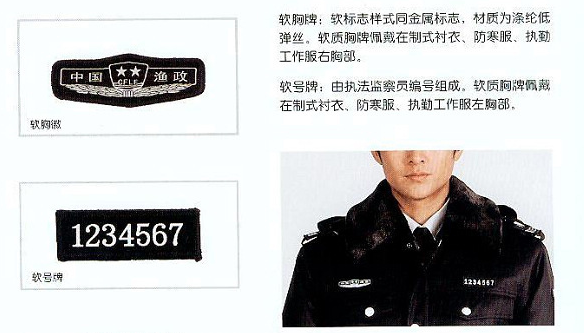 (一)標(biāo)識(shí)內(nèi)容 1、胸標(biāo)。胸標(biāo)由胸號(hào)和胸牌組成 。胸號(hào)為漁業(yè)行政人員屬地及證號(hào)碼組成;胸牌由漁政標(biāo)志和“中國(guó)漁政”字樣及體現(xiàn)著裝者職級(jí)的五角星組成 ,胸牌上五角星的顆粒數(shù)體現(xiàn)著裝者的職級(jí)身份,其中科級(jí)以下二顆星,科級(jí)三顆星,處級(jí)四顆星,局級(jí)五顆星。2、臂章。臂章上標(biāo)有漁政徽標(biāo)、橄欖枝和兩行字。第一行字統(tǒng)一為“中國(guó)漁政”。第二行字體現(xiàn)漁政人員的屬地。