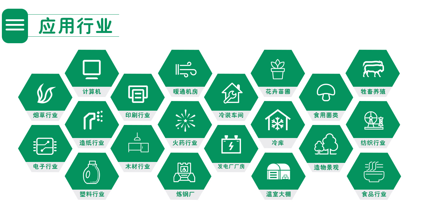 煙草行業(yè):像高煙葉柔韌性,含水率。 印刷行業(yè):除靜電,設備不卡紙,提高生產(chǎn)效率。 計算機房:恒溫系統(tǒng),除靜電,防止短路。暖通機房: 中央空調恒濕系統(tǒng),降溫省能耗、除靜電。食用菌種植:調節(jié)茹房濕度,促進食用菌的生長,保證食用菌的穩(wěn)產(chǎn)高產(chǎn)。